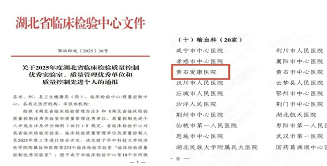近日,湖北省临床检验中心发布了《关于2025年度临床检验质量控制优秀实验室、质量管理优秀单位和质量控制先进个人的通报》,黄石爱康医院输血科实验室荣获“2025年度临床检验质量控制优秀实验室”称号。湖北省仅有20家输血科实验室获得此荣誉,能获得此殊荣充分体现了我院输血科在综合技术实力与管理水平上得到了省临检中心的高度肯定,更是对守护临床用血安全、践行生命至上的有力证明。